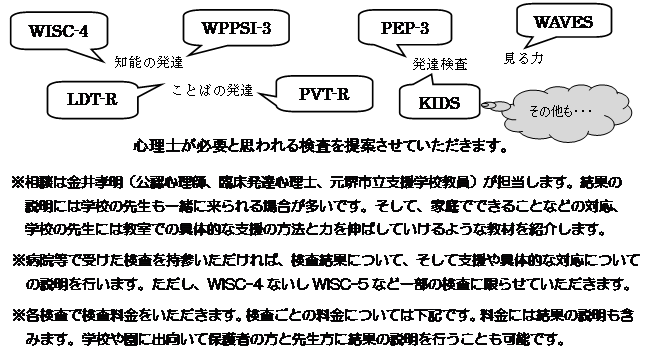 教育相談および必要に応じてお子さんにさまざまな検査も実施しています(有料にはなりますが)。
