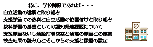学校の先生方からの相談も受け付けています。認知発達課題の設定、教科と自立活動の関連、支援学級の運営について・・・など。